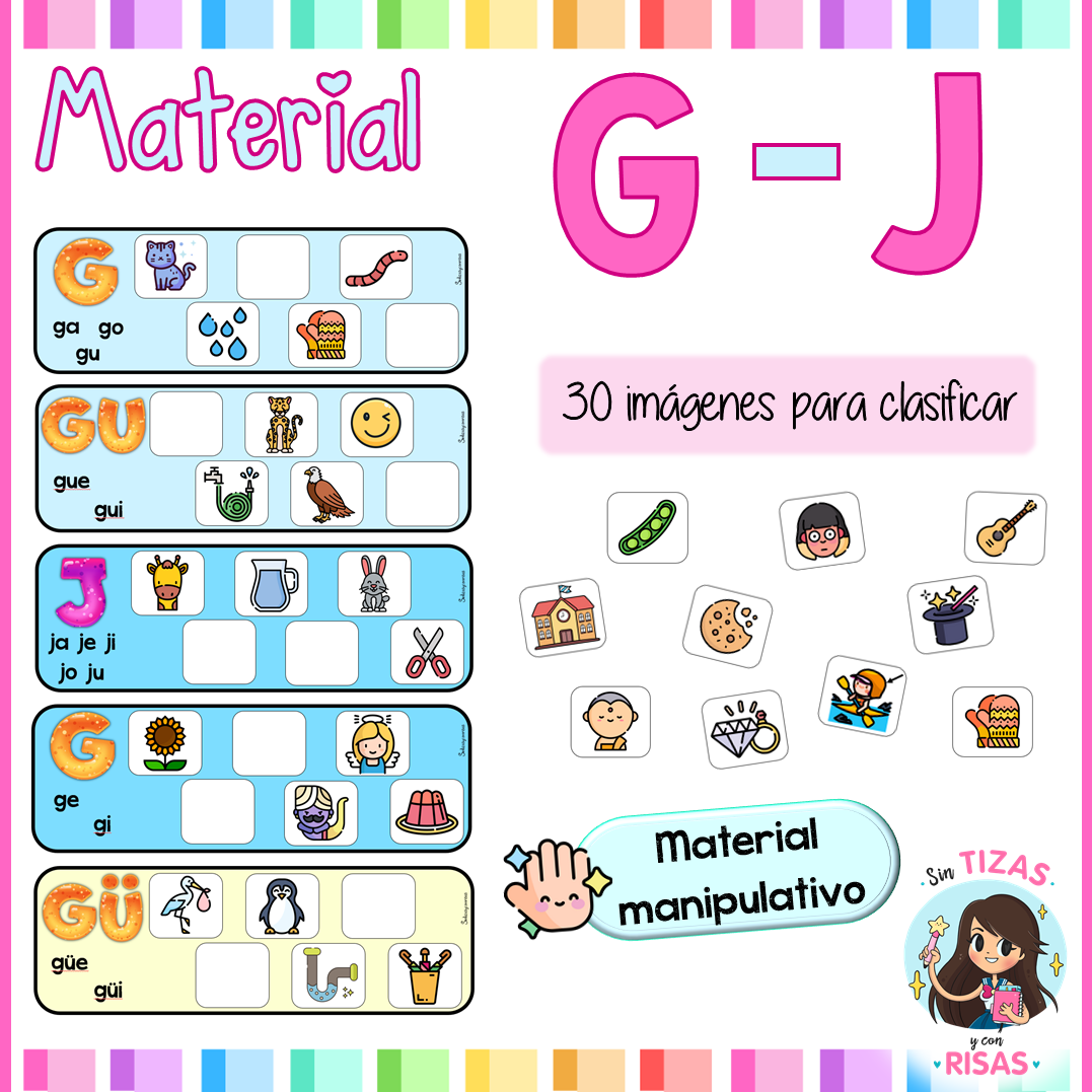 Material manipulativo para clasificar palabras y G, GU, GÜ, J. Recortables.